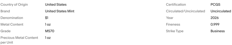 2026 (W) $1 American Silver Eagle PCGS MS70 FDOI Flag Label
